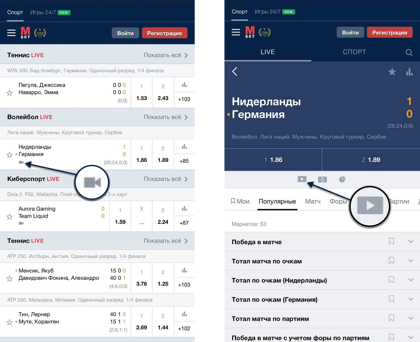 Видеотрансляции в БК представлены в ограниченном количестве. Для того, чтобы начать просмотр прямой трансляции, необходимо перейти в режим LIVE и выбрать событие с соответствующей иконкой в виде камеры. Далее перейти на страницу события и нажать на иконку Play.