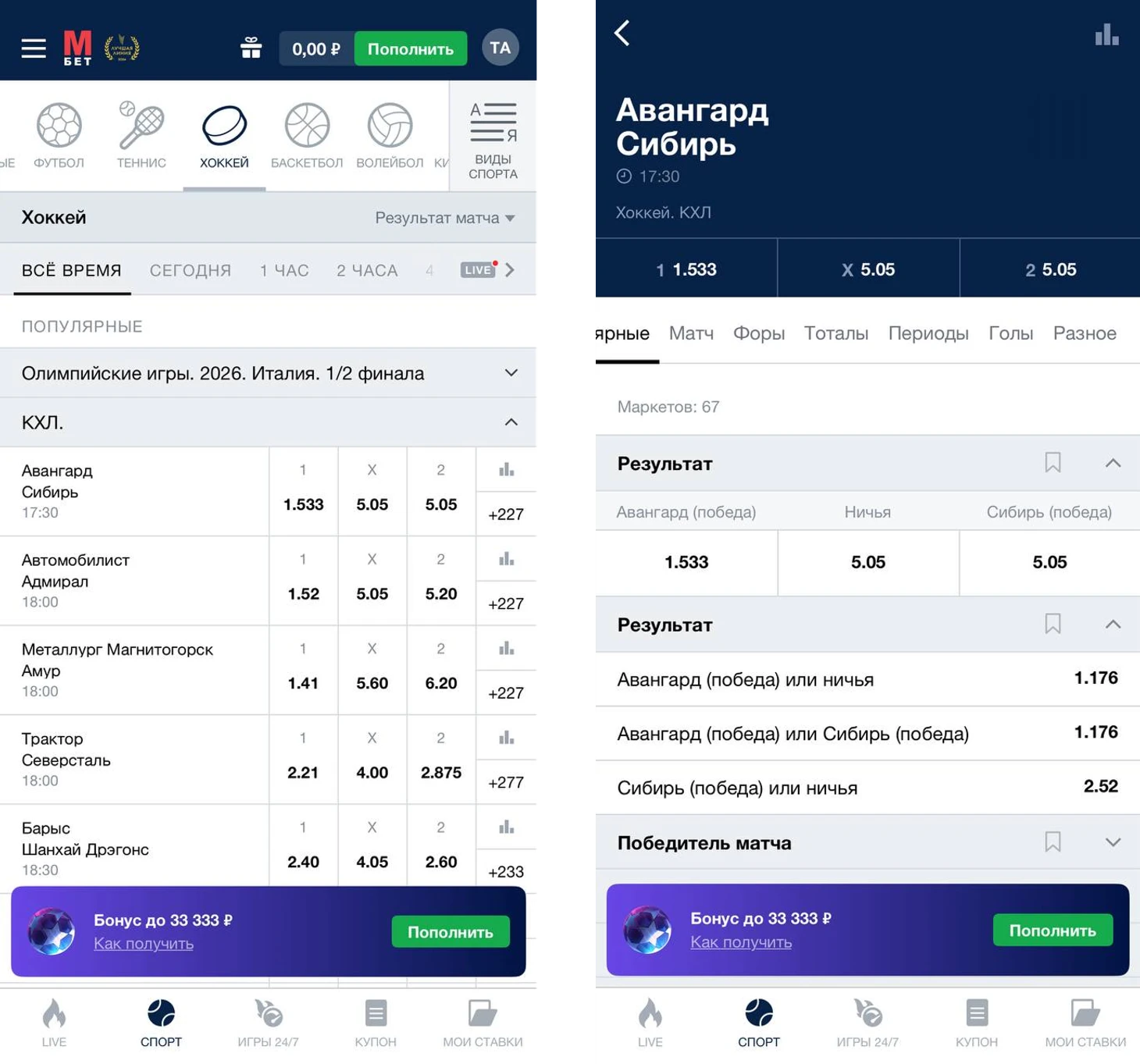 Из хоккейных турниров представлены НХЛ, КХЛ, все главные европейские чемпионаты. Дополняют хоккейную линию и менее престижные события – товарищеские турниры, чемпионат Австралии, Японии. Они пользуются особой популярностью в межсезонье. Роспись на матчи топ-турниров – около 200-250 рынков, на малопопулярные лиги – около 80, хотя бывает и меньше. Есть много вариантов ставок на голы, интервалы, статистику (вбрасывания, удаления, броски и т.д.). Долгосрочные котировки так же доступны, можно заранее выбрать чемпиона КХЛ или НХЛ.