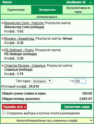 • Бонус «Авансовое пари» позволяет сделать ставку даже в том случае, когда на счету у клиента нет денег. При этом необходимо, чтобы у игрока были нерассчитанные ставки. Если же после расчета ставок сумма на счету будет меньше, чем сумма аванса, то контора покроет непогашенный остаток.
